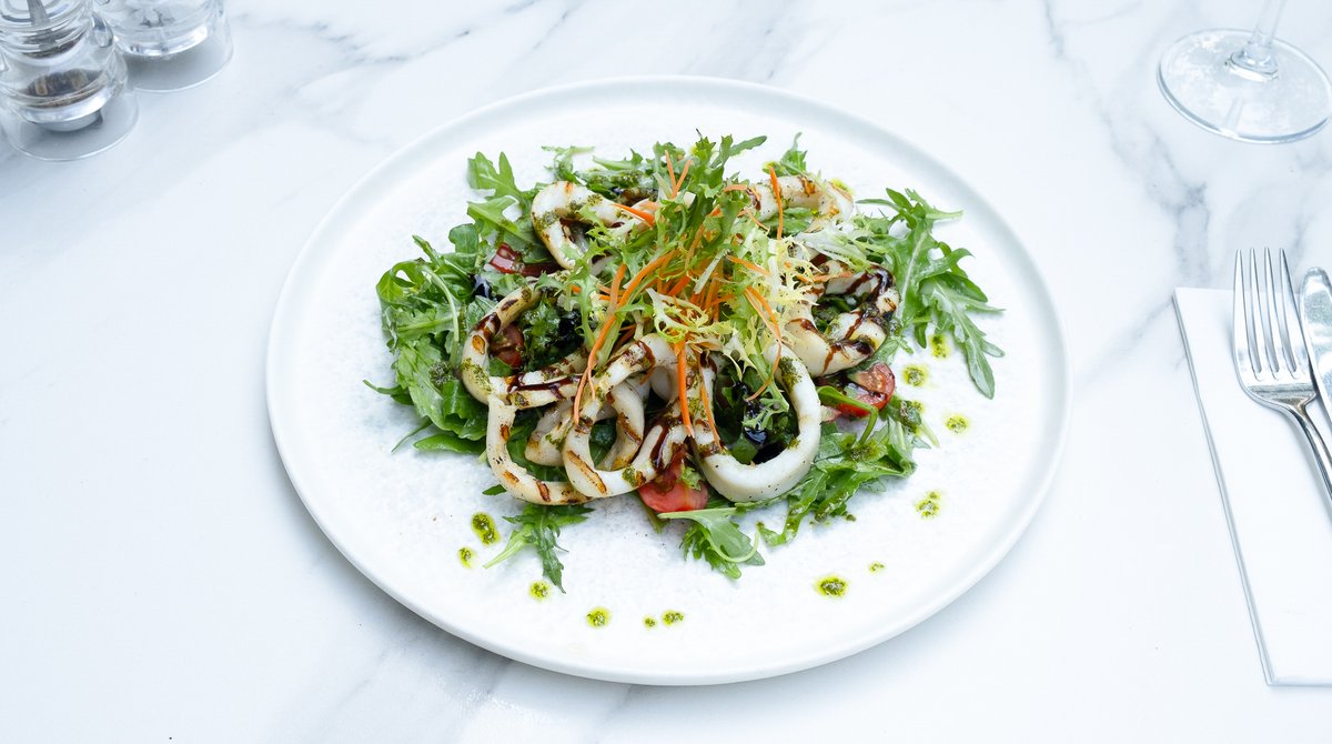 Detalii și valori nutriționale: Calamar (270g, congelat), Ulei (150g), Roșii cherry (100g), Rucola (80g), Ulei măsline (10g), Usturoi (5g), Sare (5g), Busuioc (3g), Cremă cu oțet balsamic 3g (Oțet de vin, Oțet balsamic), Piper măcinat (2g), Parmezan 2g (Lapte de vacă 3%, Sare)