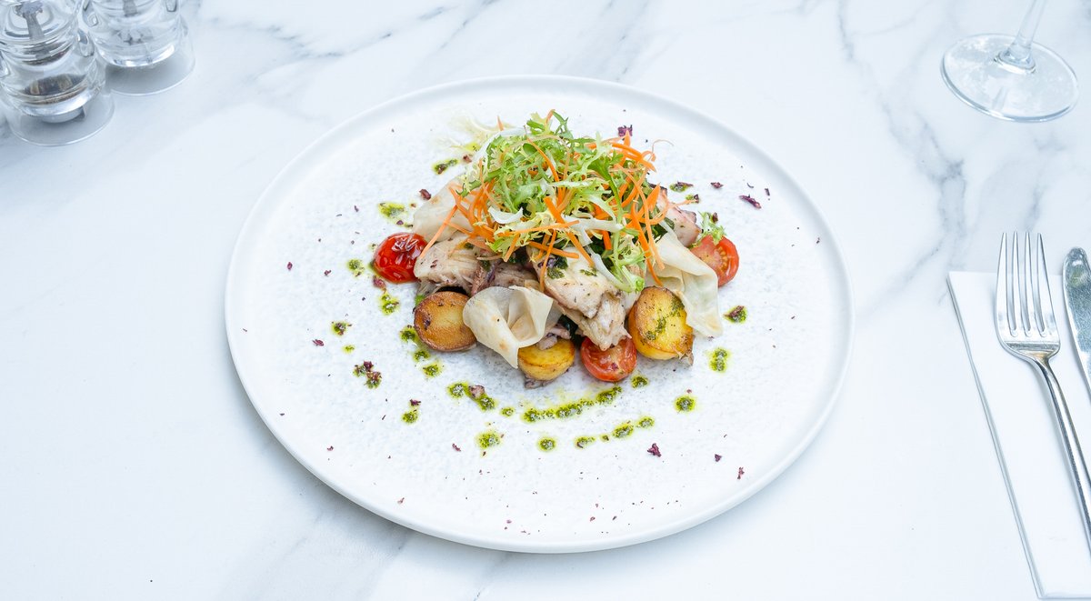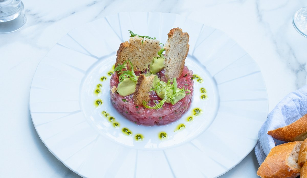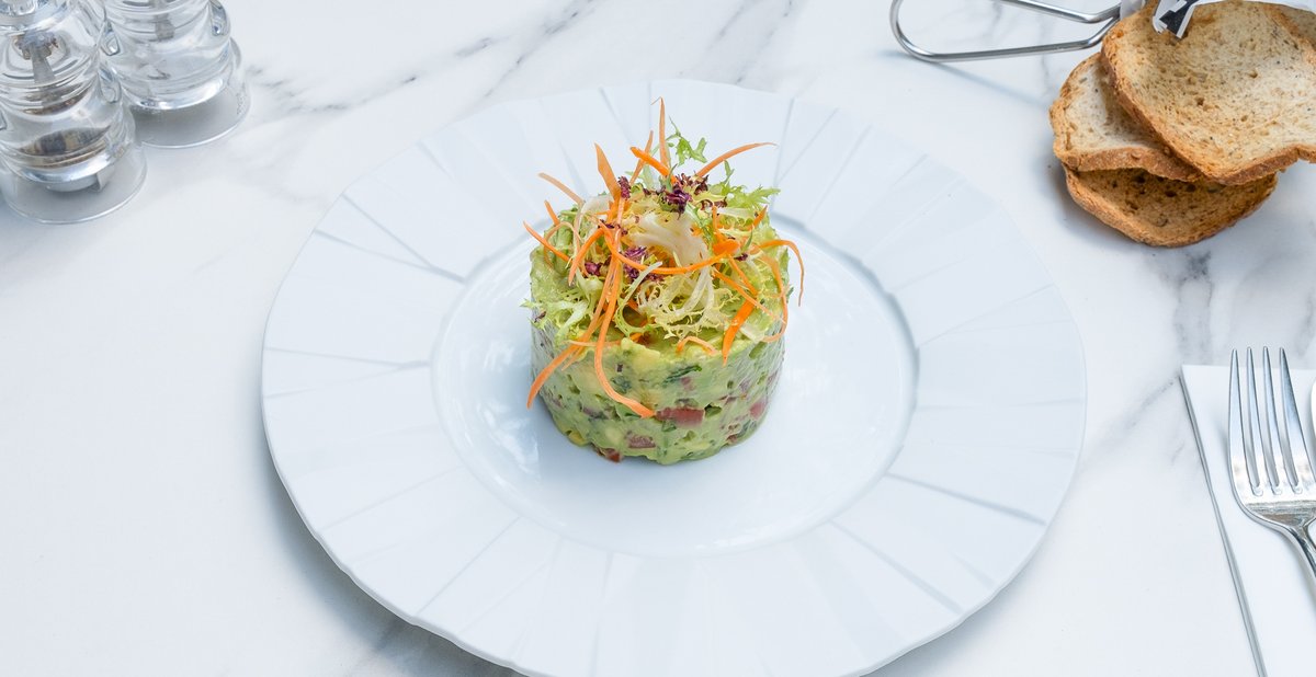 File ton roșu (180g, congelat), Castraveți (50g), Avocado (50g), Ceapă (20g), Sos de maioneză 15g (Zahăr, Oțet, Gălbenuș de ou, Lămâie, Ulei de rapiță, Sare), Smântână lichidă 35% 15g (Lapte de vacă gras, pasteurizat), Ulei măsline (13g), Chivas (decor) (6g), Sare (5g), Piper măcinat (3g), Oțet de vin (2g)