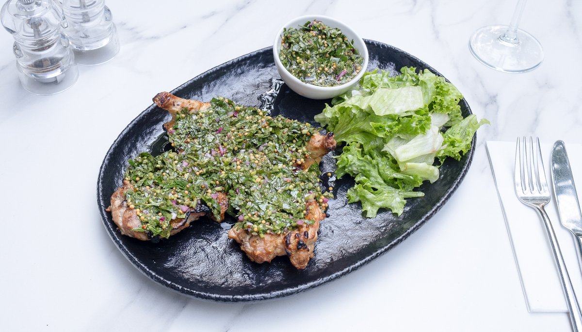 Puișor (350g, congelat), Cartofi (250g), Salată mozaic (50g), Salată iceberg (50g), Muștar franțuzesc 40g (Zahăr, Curcuma, Oțet, Boabe muștar, Sare), Ulei măsline (30g), Ceapă (30g), Pătrunjel (20g), Lime (6g), Ulei (5g), Sare (5g), Usturoi (3g), Piper măcinat (2g)