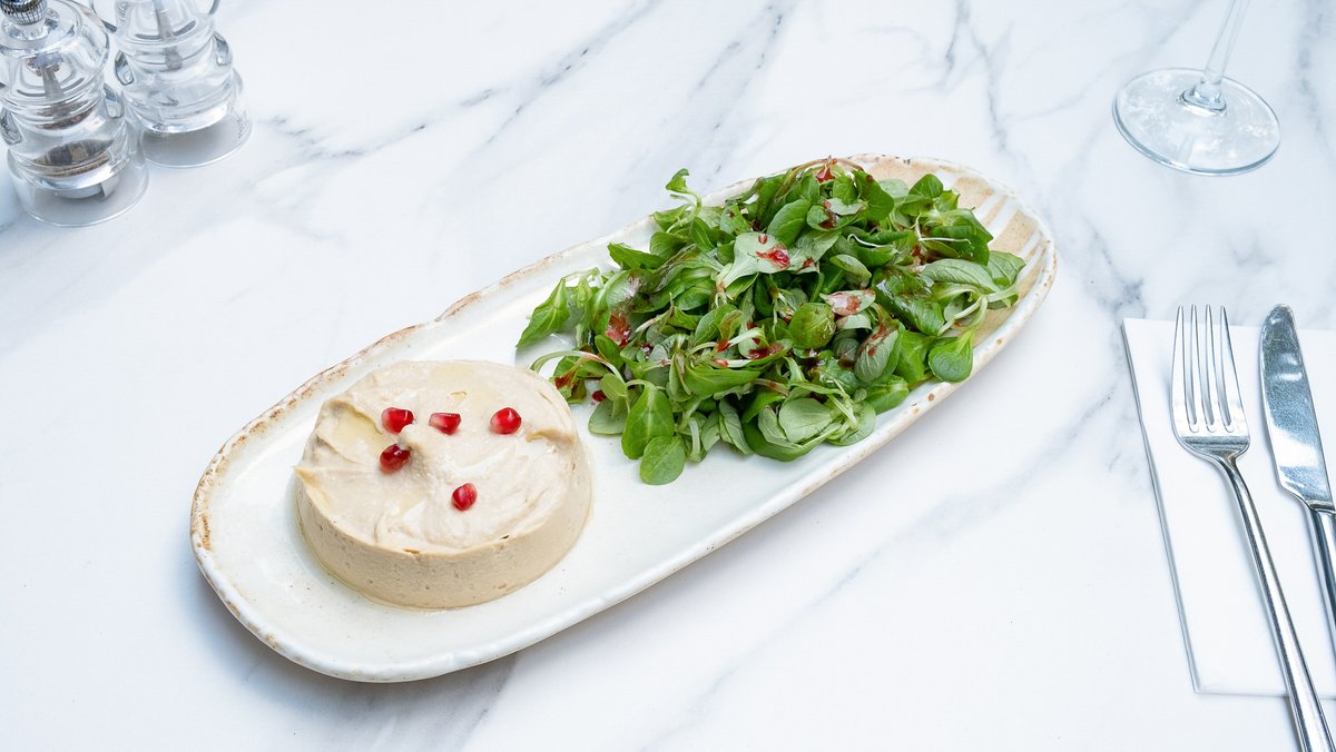 Năut (250g), Pită grecească 80g (Ulei floarea soarelui, Drojdie proaspătă, Făină, Sare), Valeriană (50g), Caju (15g), Ulei măsline (10g), Rodii (10g), Pastă tahina 10g (Muguri de pin, Ulei de palmier, Semințe susan, Sare), Usturoi (3g), Sare (3g), Piper măcinat (2g)