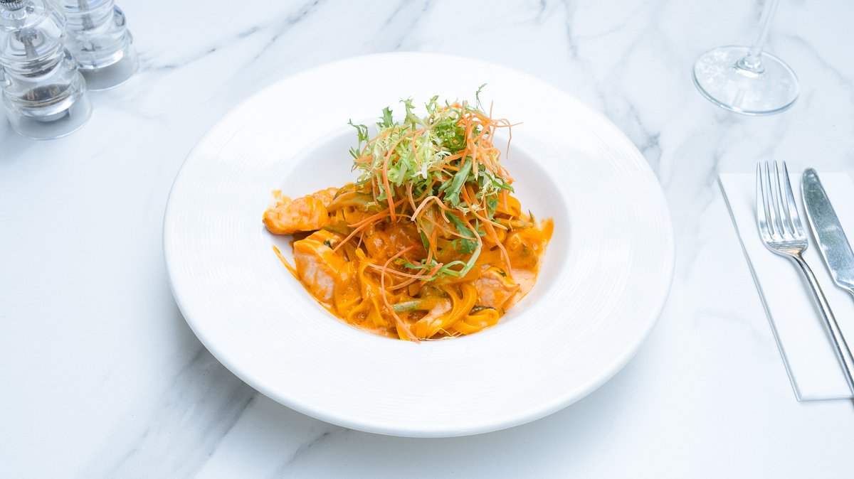"Somon (150g, congelat), Paste proaspete 120g (Ouă ecologice, Ulei, Făină de grâu), Roșii în conservă 80g (Roșii, Sare), Dovlecei (50g), Smântână lichidă 35% 50g (Lapte de vacă gras, pasteurizat), Sparanghel (40g), Usturoi (15g), Ghimbir murat (10g)"