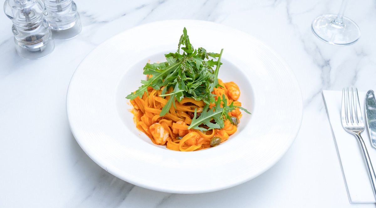 Creveți (180g, congelat), Paste proaspete 120g (Ouă ecologice, Ulei, Făină de grâu), Roșii în conservă 40g (Roșii, Sare), Roșii uscate în ulei 20g (Oțet de vin, Ulei floarea soarelui, Roșii), Capere în oțet 20g (Oțet de vin, Capere, Sare), Usturoi (15g), Rucola (15g), Vin (15g), Ghimbir murat (10g)