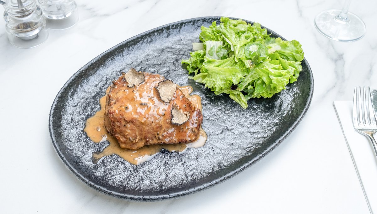 Mușchi de vită (200g, congelat), Salată mozaic (50g), Morcovi (50g), Ceapă (50g), Ficat de rață (30g, congelat), Tartufata 30g (Ulei de măsline, Ciuperci, Ulei floarea soarelui, Trufe, Măsline negre, Sare), Sos Demi Glace 20g (Zahăr, Piper măcinat, Sare), Unt 82% grăsime 20g (Lapte pasteurizat 0.1% Natura), Coniac (5g), Sare (4g), Piper măcinat (2g)