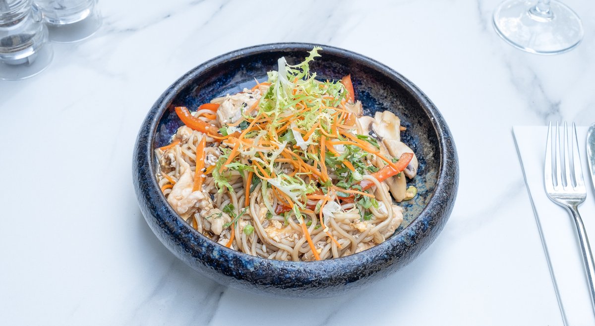 Piept de pui (120g), Tăiței de casă 120g (Ouă ecologice, Făină, Sare), Ciuperci (60g), Ouă ecologice (60g), Ardei gras (60g), Usturoi (50g), Morcovi (50g), Ciuperci Pleurotus (40g), Sos stridii 13g (Zahăr, Sare), Sos de soia 10g (Oțet de orez, Sare), Ulei de susan 10g (Semințe susan), Susan (5g)