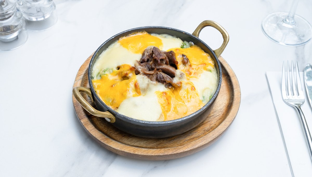 Pulpe rață confiată (450g), Cartofi (300g), Brânză emmentaler 60g (Sare), Ceapă verde (50g), Ceapă (50g), Morcovi (40g), Sos Demi Glace 20g (Zahăr, Piper măcinat, Sare), Unt 82% grăsime 20g (Lapte pasteurizat 0.1% Natura), Cheddar 20g (Lapte pasteurizat 0.1% Natura, Sare), Smântână lichidă 35% 20g (Lapte de vacă gras, pasteurizat), Coniac (10g), Sare (4g), Piper măcinat (2g)