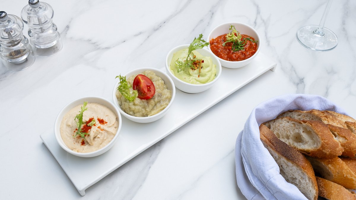 "Împarte. Aperitiv pentru 2 persoane. Vinete coapte (230g), Năut (150g), Zacuscă 130g (Zahăr, Ulei floarea soarelui, Ardei gras, Piper măcinat, Roșii, Ceapă, Vinete coapte, Sare), Avocado (60g), Ceapă (30g), Caju (20g), Roșii cherry (15g), Ulei măsline (10g), Pastă tahina 10g (Muguri de pin, Ulei de palmier, Semințe susan, Sare), Sare (4g), Piper măcinat (2g)."
