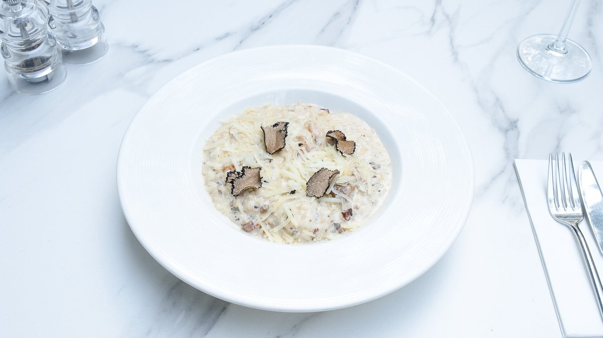 Smântână lichidă 35% 100g (Lapte de vacă gras, pasteurizat), Orez (80g), Parmezan 70g (Lapte de vacă 3%, Sare), Pancetta (60g), Ceapă (60g), Hribi (50g), Tartufata 25g (Ulei de măsline, Ciuperci, Ulei floarea soarelui, Trufe, Măsline negre, Sare), Vin alb Jidvei Chardonnay (15g), Unt (10g)