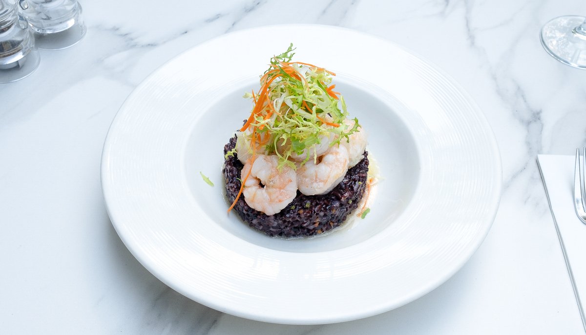 Creveți (180g, congelat), Orez negru (80g), Parmezan 70g (Lapte de vacă 3%, Sare), Ardei gras (50g), Morcovi (50g), Apio (30g), Unt 82% grăsime