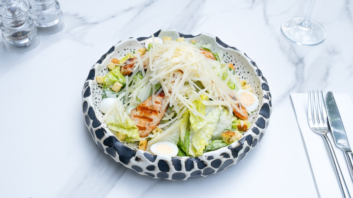 Piept de pui (120g), Salată română (80g), Parmezan 80g (Lapte de vacă 3%, Sare), Ouă de prepeliță (50g), Smântână lichidă 35% 50g (Lapte de vacă gras, pasteurizat), Usturoi (20g), File de pește anșoa în ulei de floarea-soarelui 20g (Ulei floarea soarelui, File de anșoa 365, Sare), Sos de maioneză 10g (Zahăr, Oțet, Gălbenuș de ou, Lămâie, Ulei de rapiță, Sare), Roșii cherry (0g)