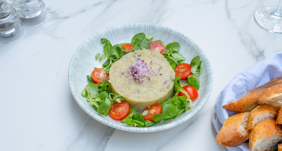 Cartofi (250g), Smântână lichidă 35% 70g (Lapte de vacă gras, pasteurizat), Tartufata 10g (Ulei de măsline, Ciuperci, Ulei floarea soarelui, Trufe, Măsline negre, Sare), Unt 82% grăsime 10g (Lapte pasteurizat 0.1% Natura) - Poza produsului este cu caracter informativ.