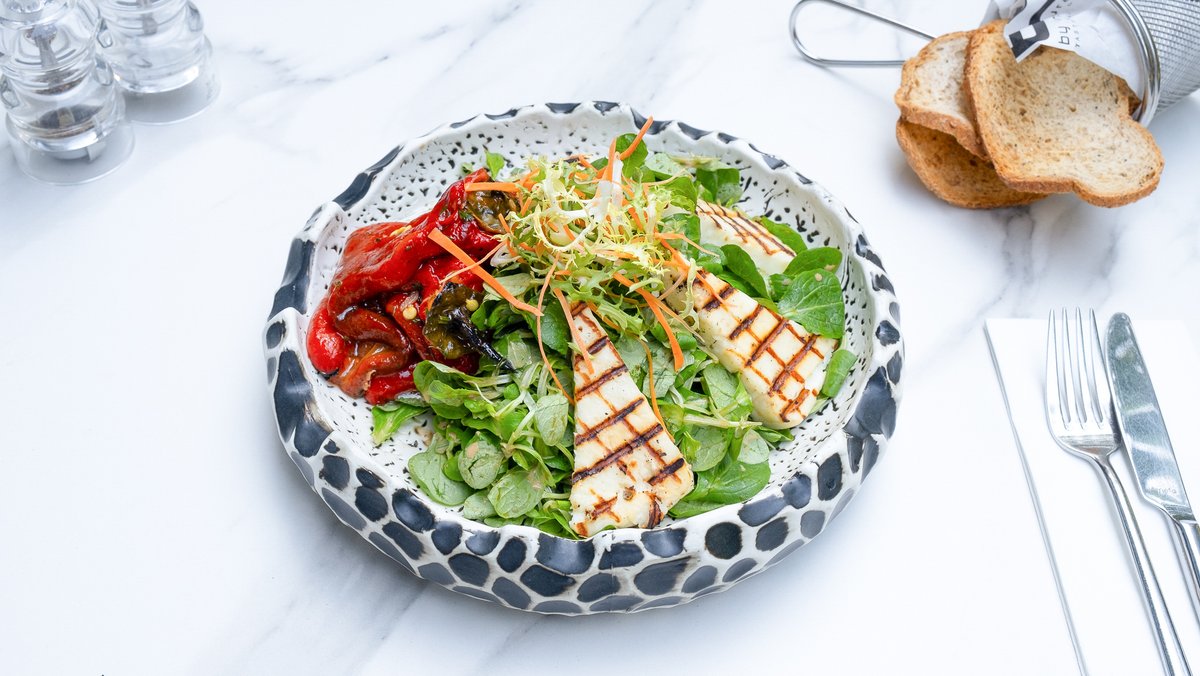 Salată cu ardei copt și halloumi