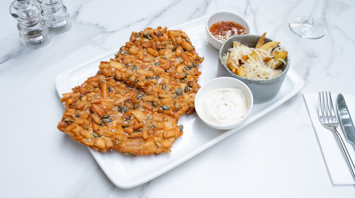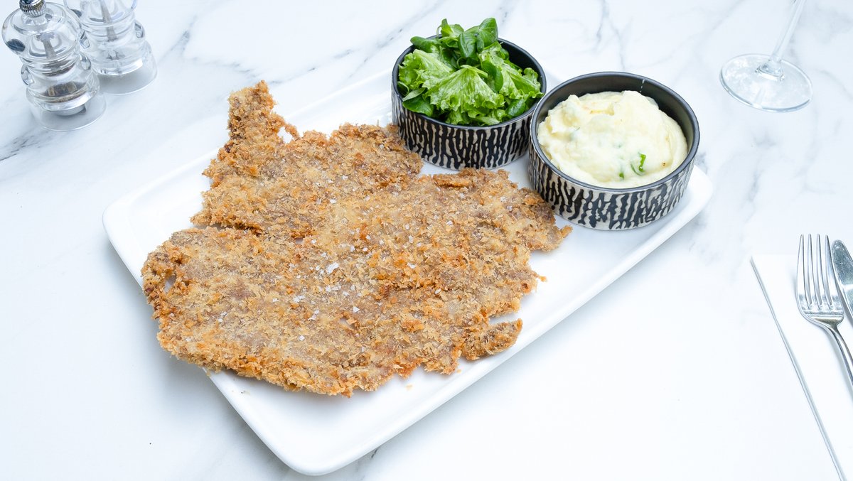 Șnițel de vită în crustă panko cu semințe de mac și piure de cartofi prăjițI