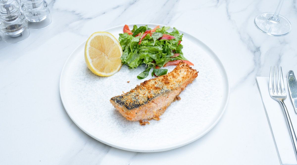 Somon (220g, congelat), Pătrunjel (10g), Salată mozaic (100g), Ardei gras (100g), Panko (60g), Parmezan 60g (Lapte de vacă 3%, Sare), Ulei măsline (15g), Rozmarin (10g), Cimbru (10g), Sare (5g), Muștar Dijon 5g (Oțet de mere cu miere, Boabe muștar, Sare), Piper măcinat (2g)