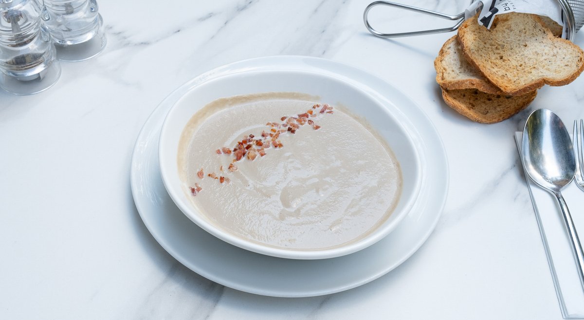 Supă cremă de ciuperci cu bacon copt