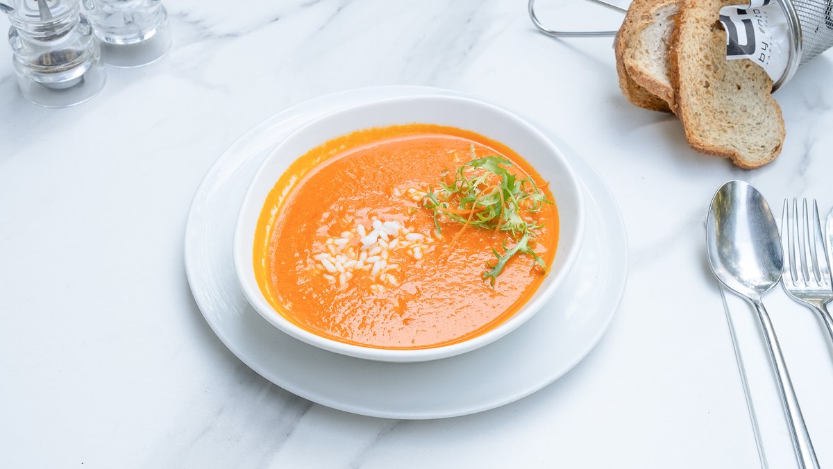 Roșii (200g), Roșii în bulion (100g), Ceapă (60g), Orez (40g), Ulei măsline (40g), Usturoi (10g), Busuioc (5g)