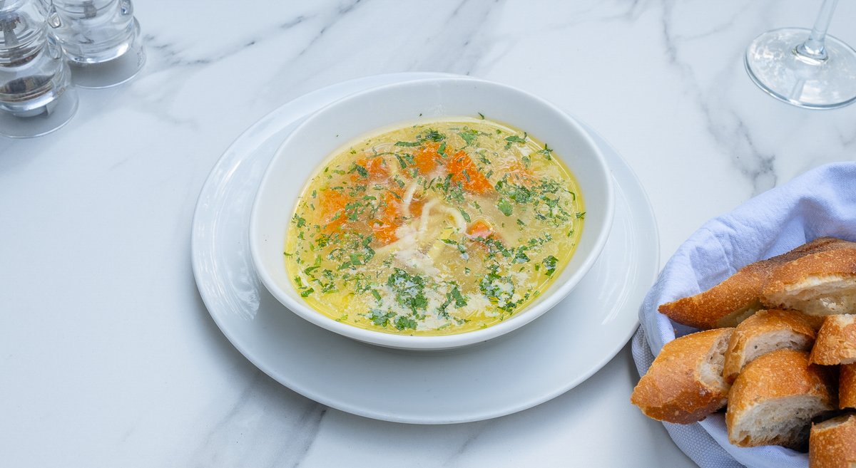 Piept de pui (120g), Morcovi (80g), Tăiței de casă 60g (Ouă ecologice, Făină, Sare), Țelină (50g), Ceapă (20g)
