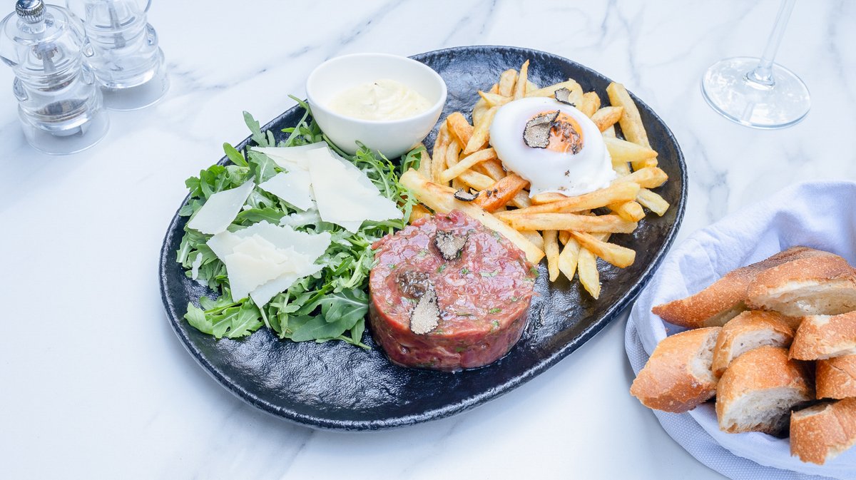 Mușchi de vită (150g, congelat), Cartofi (30g), Ceapă (30g), Capere în oțet 30g (Oțet de vin, Capere, Sare), Ouă ecologice (60g), Pătrunjel (10g), Ulei (10g), Ketchup 10g (Zahăr, Oțet, Roșii, Sare), Tartufata 10g (Ulei de măsline, Ciuperci, Ulei floarea soarelui, Trufe, Măsline negre, Sare), Ulei măsline (5g), Sare (5g), Piper măcinat (3g), Tabasco 2g (Oțet de vin, Ardei iute, Sare)