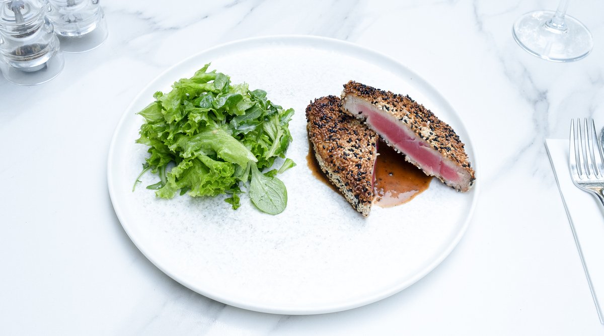 Ulei măsline (10g), File ton roșu (190g, congelat), Salată mozaic (100g), Susan (50g), Sos Demi Glace 30g (Zahăr, Piper măcinat, Sare), Smântână lichidă 35% 30g (Lapte de vacă gras, pasteurizat), Boabe de piper negru (20g), Coniac (20g), Ulei (20g), Unt (10g), Sare (5g)