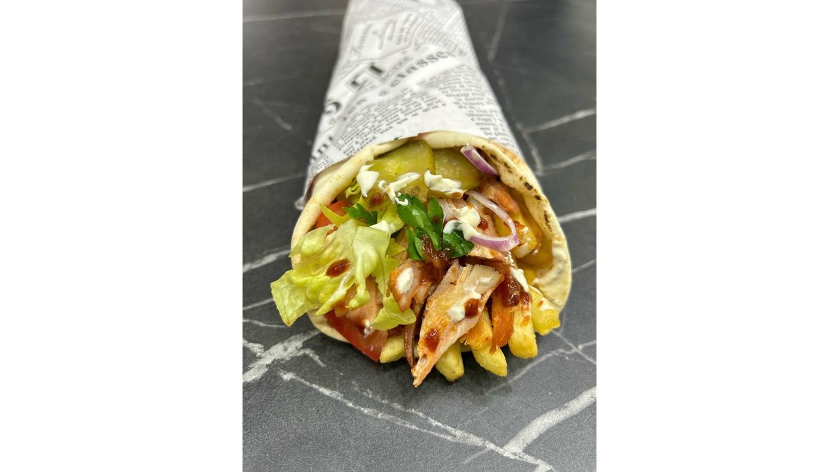 Lipie, carne de pui, cartofi prăjiți, varză, salată verde, ardei picant, roșii, castraveți murați, ceapă, sosuri 500g