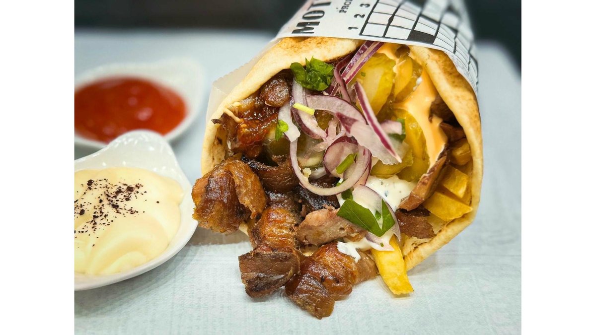 Lipie, carne de vită, cartofi prăjiți, varză, salată verde, ardei picant, roșii, castraveți murați, ceapă, sosuri - 500g