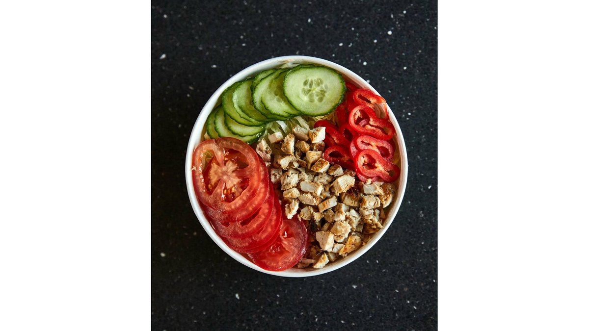 Salată iceberg,rucola, piept pui la grătar,roșii,castraveți,ardei roșu,focaccia