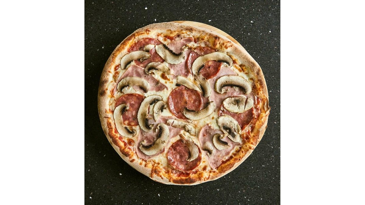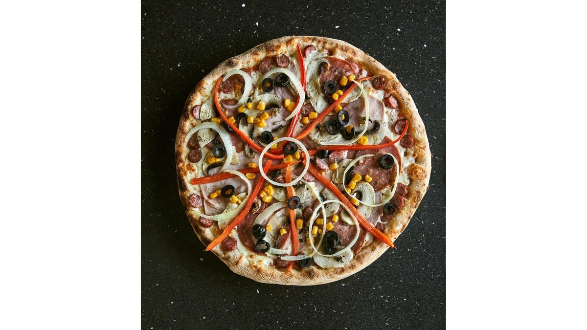 Sos de roșii san marzano, mozzarella ,prosciutto cotto,salam, ciuperci,porumb, ardei,ceapă roșie, măsline, cârnați