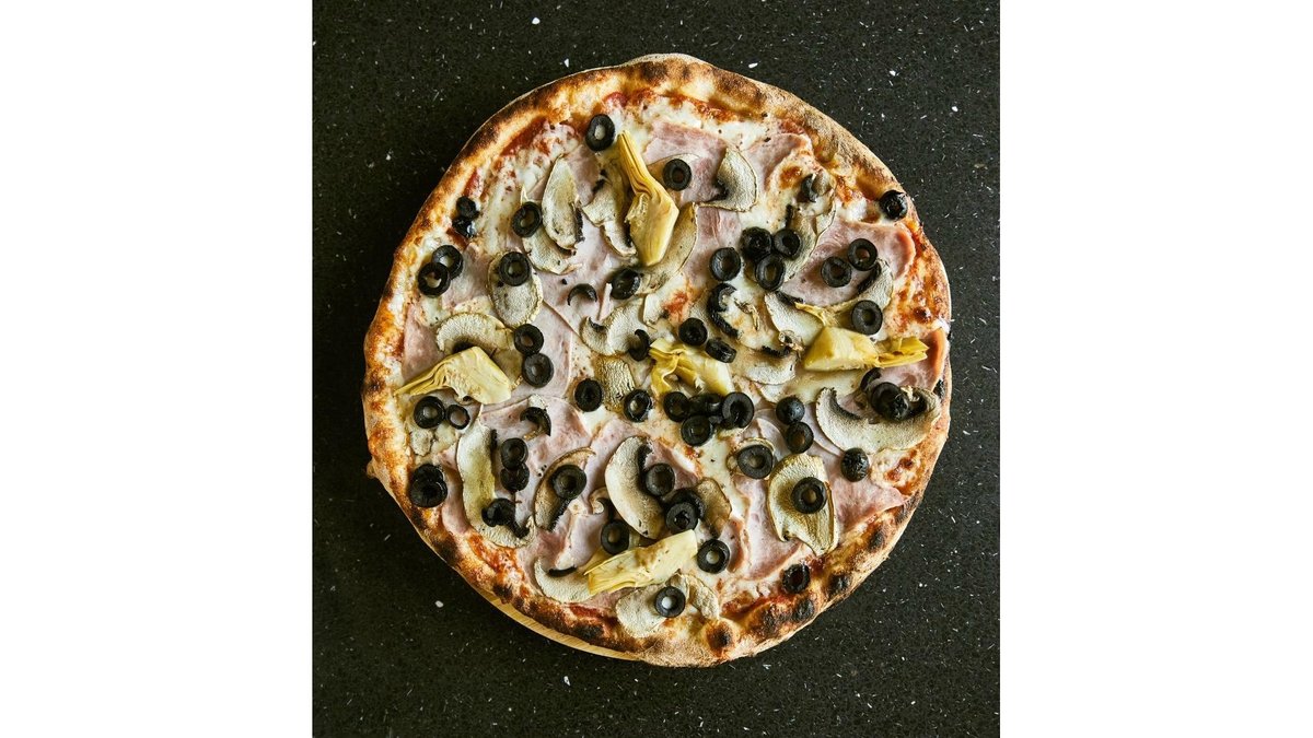Sos de roșii san marzano, mozzarella,prosciutto cotto,ciuperci,măsline,anghinare