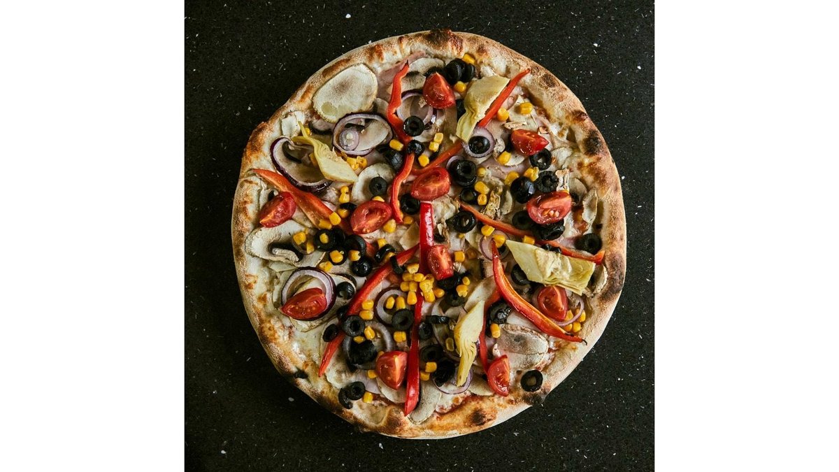 Sos de roșii san marzano,mozzarella, porumb,ardei,ciuperci,măsline, dovlecei, roșii cherry,ulei de măsline