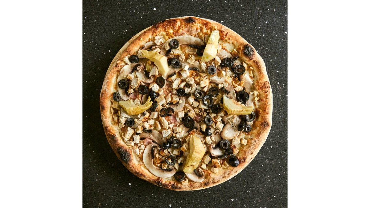 Sos de roșii san marzano,mozzarella, pui, ciuperci,anghinare,măsline