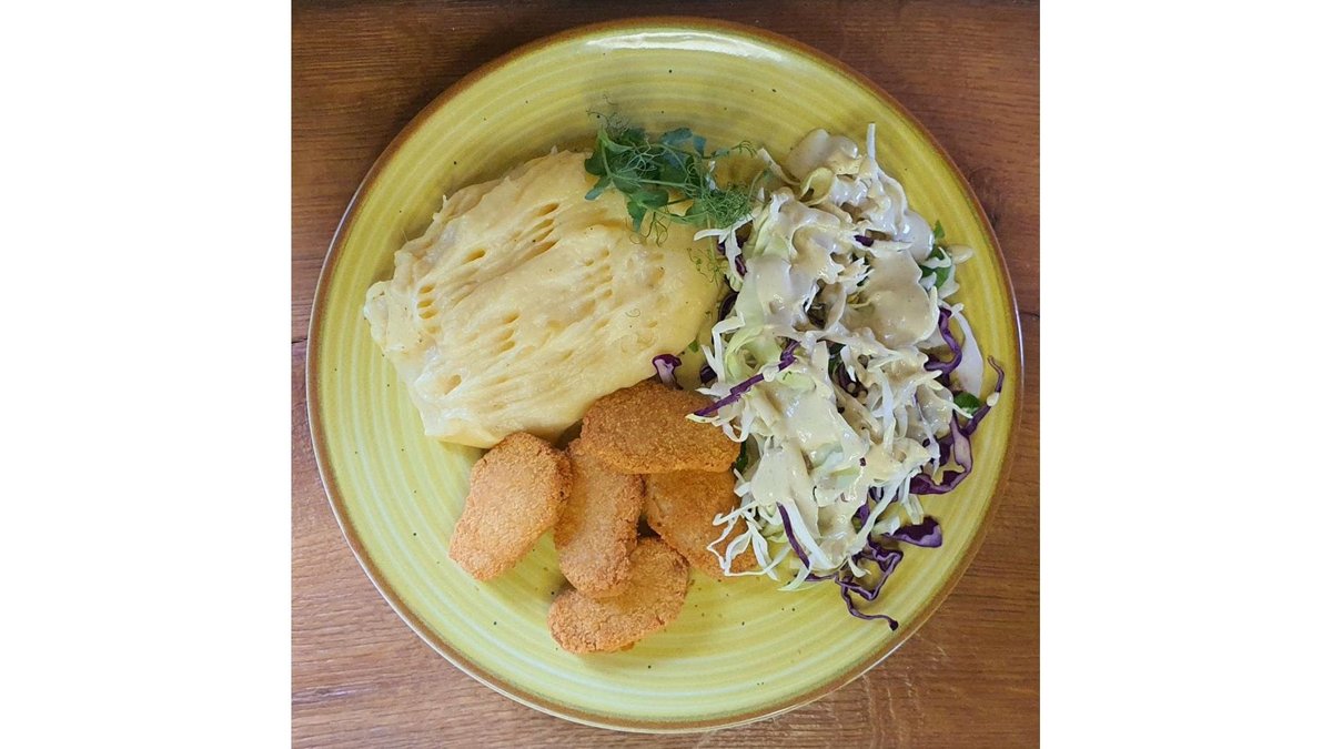 Nuggets pe baza de soia, piure din cartofi și talina, salata de varza cu dressing din lămâie, ulei de masline, 350 gr
