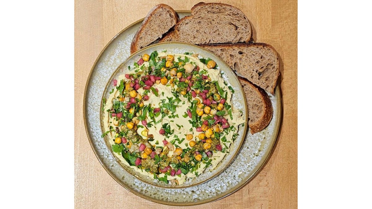 Paine cu maia, hummus cu tahini, usturoi si sfecla rosie coapta, mix de salata, avocado, susan negru, tahini negru, ulei aromatizat, seminte de susan, vlastari. 200 gr