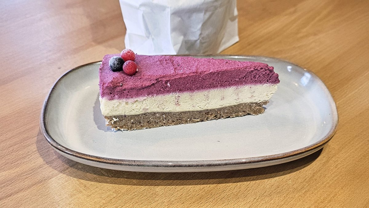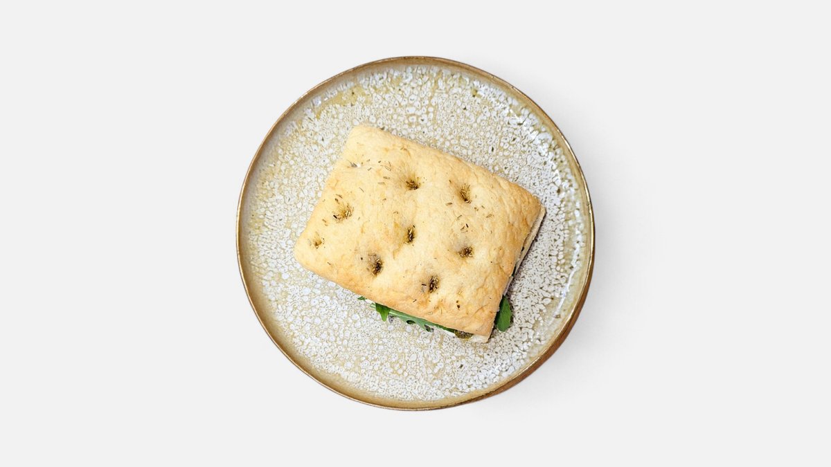 Focaccia (faina alba de grau, apa, drojdie, uleide masline, rozmarin, zahar, sare), tartinabil pe baza de tofu (tofu, ulei vegetal, condimente, sare, aroma vegan de branza, agent de ingrosare: xantan si guar), mortadella vegana cu fistic (apa, amidon, 2,8% proteina de mazare, fibra de citrice, sare alimentara neiodata, aroma, condimente, concentrat de ridichi, agenti de ingrosare: guma xantan, guma konjac, caragenan, acid ascorbic, aroma de fum, extract de ardei, ulei vegetal de floarea-soarelui, 1,7% FISTIC, dextroza, tarate de psyllium, carbonat de calciu), rucola, pesto vegan rosu (rosii uscate, ulei de masline extravirgin, pasta de rosii, sare, busuioc, patrunjel)