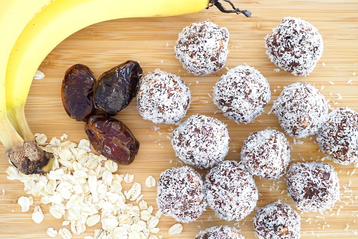 Banana, fulgi de ovaz, ulei de cocos, carob, sirop de agave, scorțișoară Ceylon, praf de copt bio, sare.