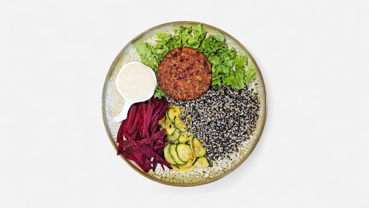 Explozie de culoare și savoare! Chiftea vegetală home-made din sfeclă și leguminoase, servită cu legume crocante, verdețuri proaspete și murături home-made (castraveți și ceapă), completată de un dressing cremos.