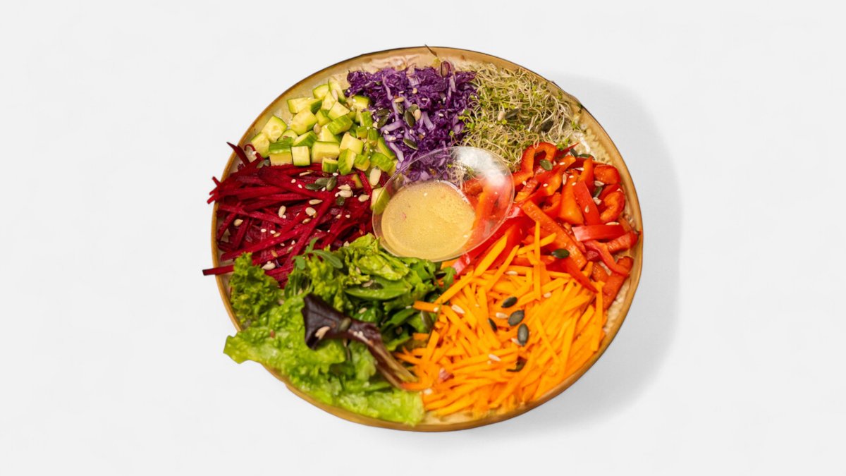 Un mix vesel de culori și texturi! Legume proaspete în nuanțe vibrante, verdețuri crocante, toppinguri hrănitoare și un dressing ușor, pentru o salată plină de energie, prospețime și bună dispoziție.