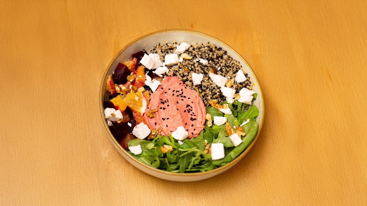 Quinoa tricolora, hummus cu sfecla copata (naut, tahini, usturoi, sfecla rosie, ulei), rucola, portocala, sfecla copata, nuca, dressing cu mustar si suc de portocala. 350 gr