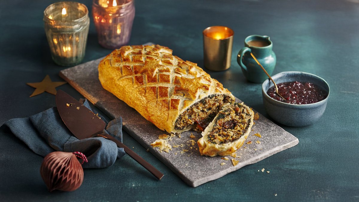 Wellington vegan cu piure cu pastarnac - 300 gr Foietaj vegan, ciuperci, ceapa, morcov, apio, usturoi, cimbru, mazare, menta, naut, migdale, sos de soia, pesmet, rosii, caju, ulei de masline, cartof, pastarnac.