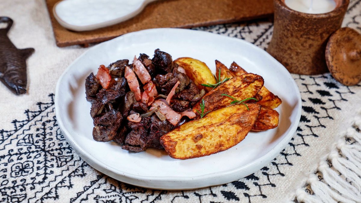 Ficăței de pui la tigaie cu vin alb și ceapă roșie și garnitură la alegere