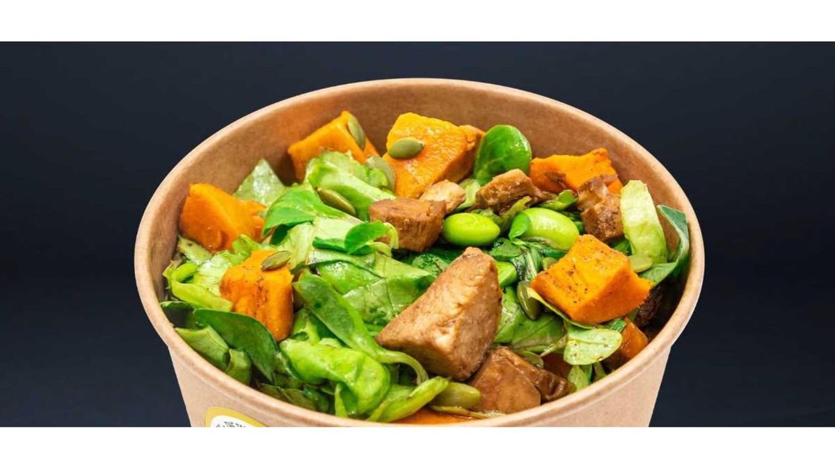Salata cu pui tras la tigaie in sos teriyaki, edamame, cartof dulce si seminte de dovleac. Mix salata din salata verde, spanac si valeriana, dressing italian (250g)