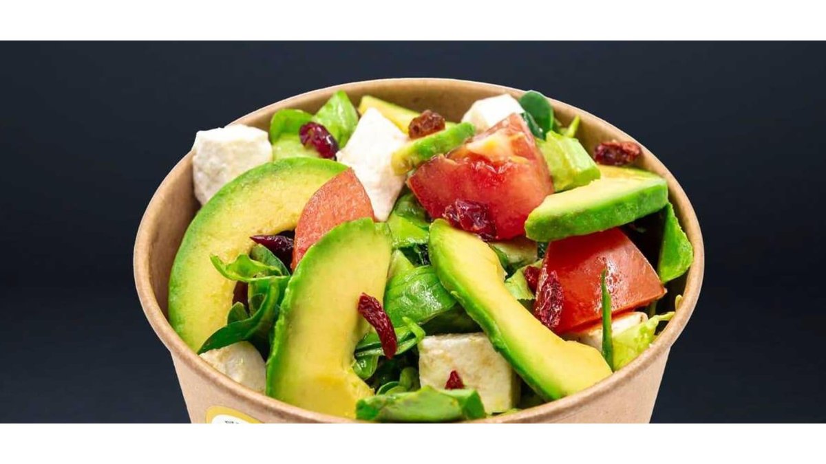 Salata cu branza de capra, rosii, avocado, merisoare confiate. Mix salata din salata verde, spanac si valeriana, dressing Italian (250g)