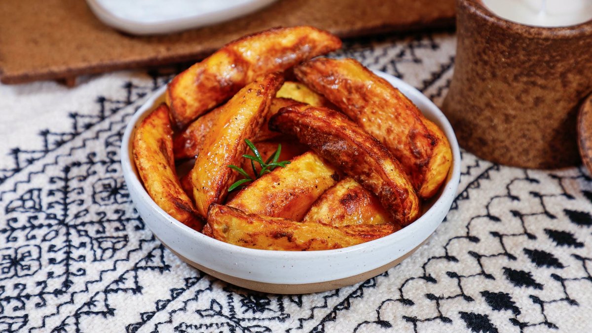 Cartofi wedges la cuptor ( cartofi , boia de ardei dulce , usturoi , sare , piper , rozmarin fresh)