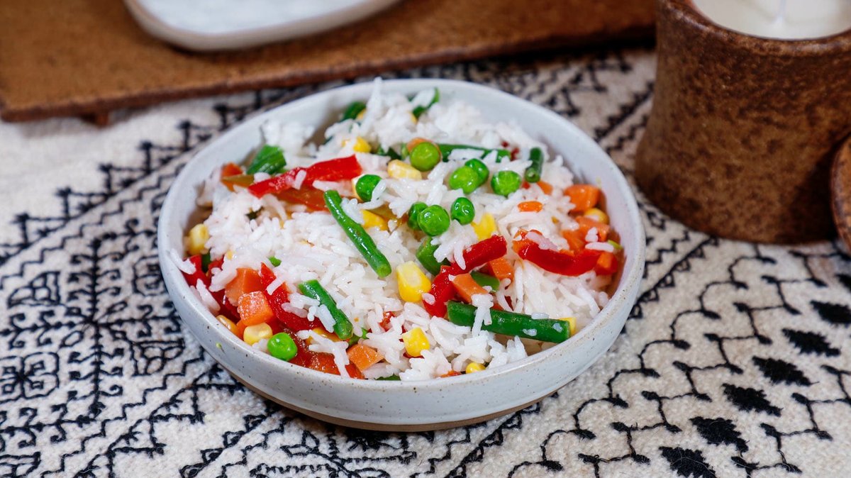 Orez basmati cu legume ( ingrediente :orez basmati , amestec mexican legume , sare , piper , pătrunjel)
