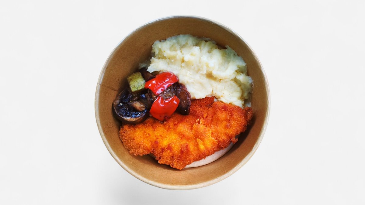 Bol cu șnițel de pui crocant, piure de cartofi cremos și legume mexicane trase la tigaie. Aproximativ 550 kcal, 32 g proteine, 44 g carbohidrați, 27 g grăsimi DISCLAIMER: Valorile nutriționale sunt aproximative și pot varia în funcție de tipul de carne, proporția de os, cantitatea de ulei folosită și timpii de gătire. Valorile au fost calculate pe baza rețetelor standardizate, însă pot exista diferențe de la o porție la alta.