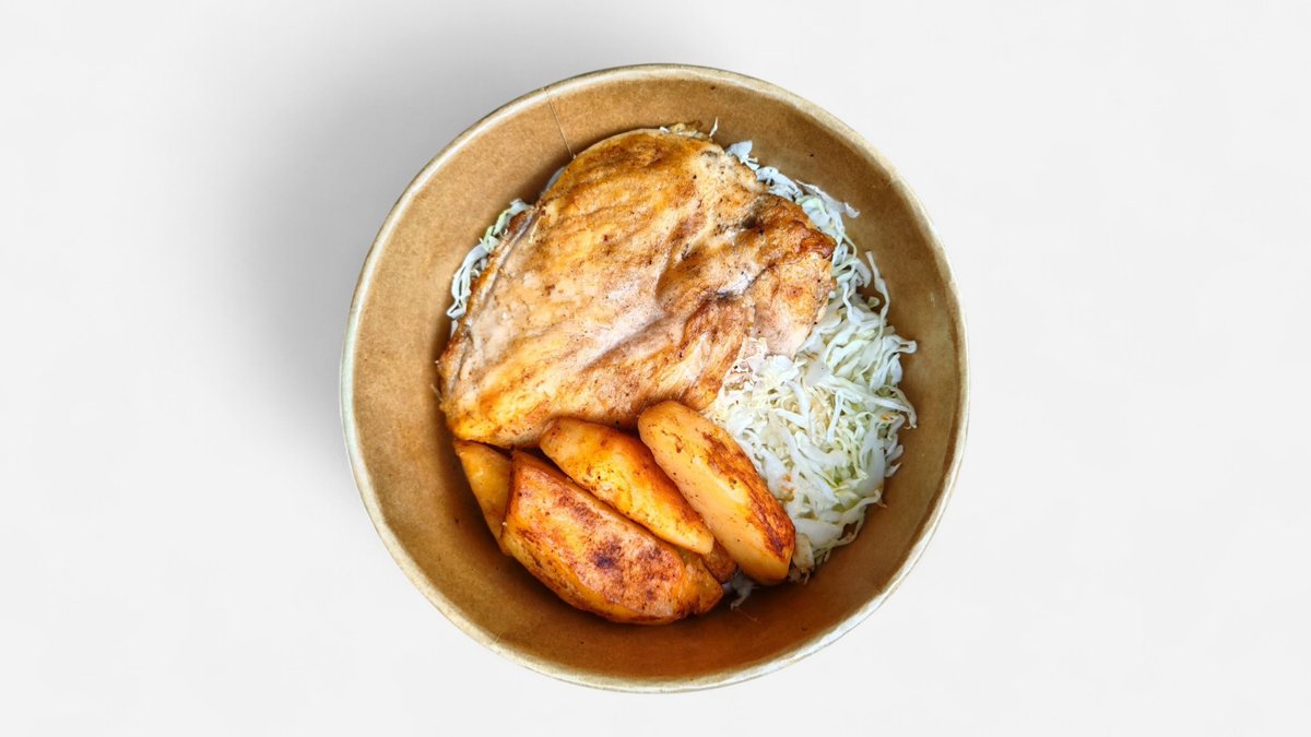 Bol cu piept de pui la grătar, cartofi wedges la cuptor și salată de varză cu dressing clasic. Aproximativ 550 kcal, 50 g proteine, 31 g carbohidrați, 17 g grăsimi DISCLAIMER: Valorile nutriționale sunt aproximative și pot varia în funcție de tipul de carne, proporția de os, cantitatea de ulei folosită și timpii de gătire. Valorile au fost calculate pe baza rețetelor standardizate, însă pot exista diferențe de la o porție la alta.
