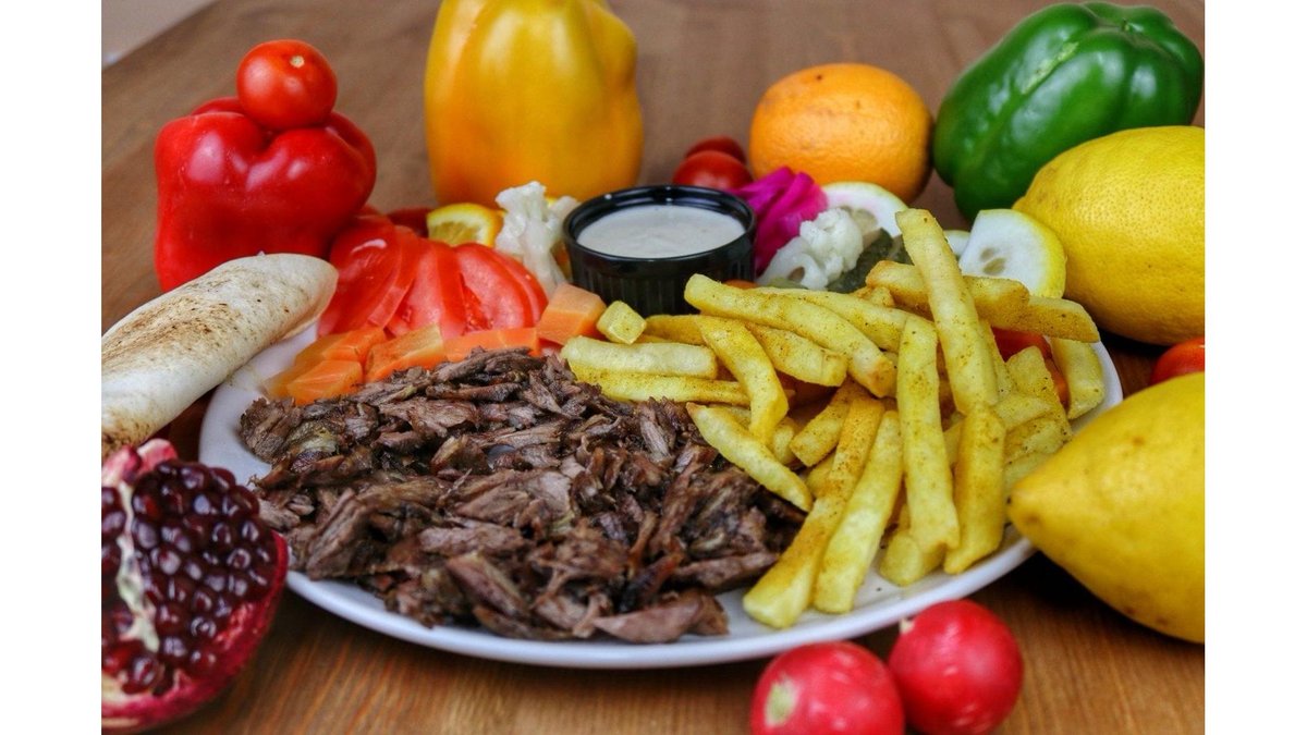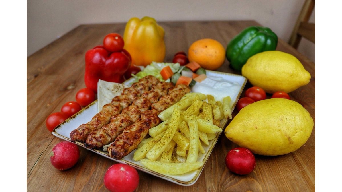 Carne berbecut, cartofi prajiti, salate, sos tahini