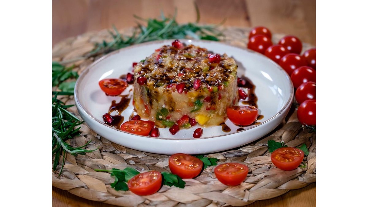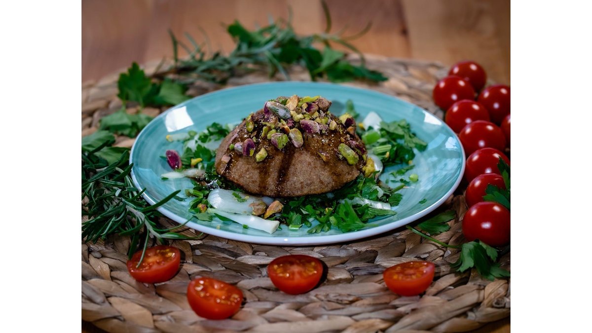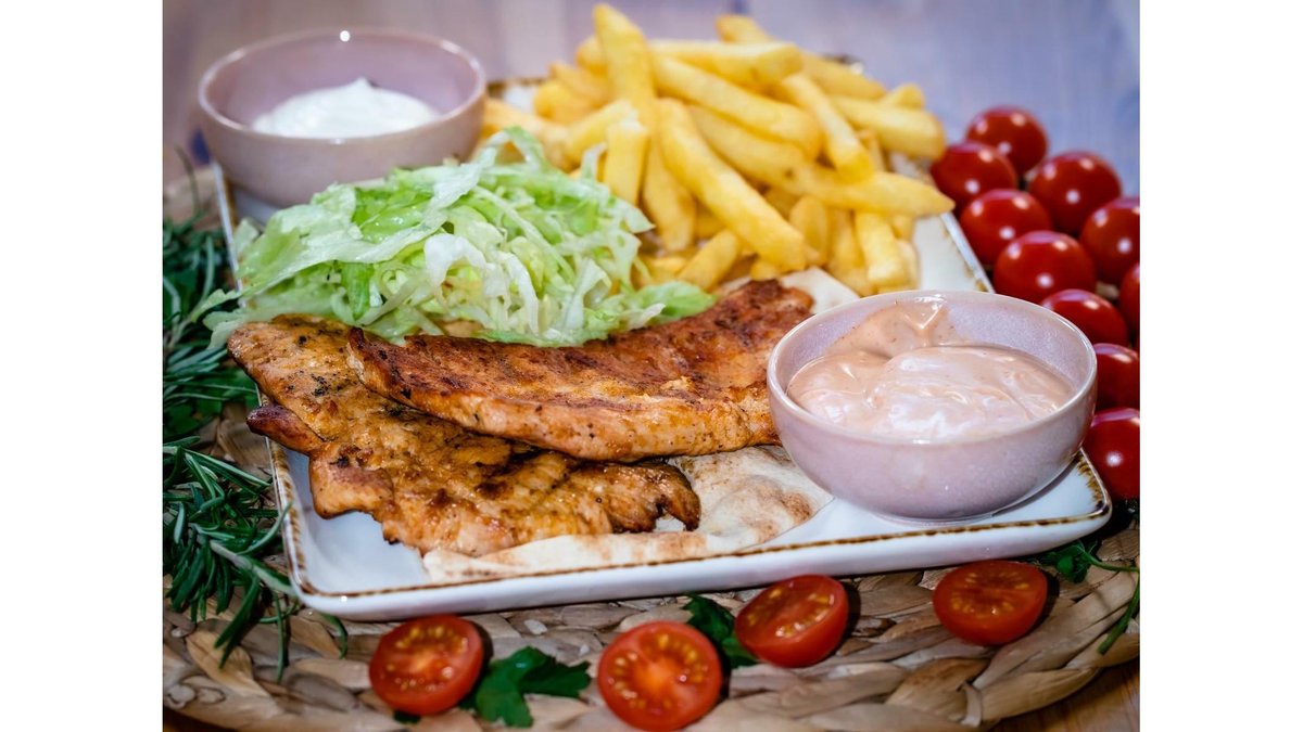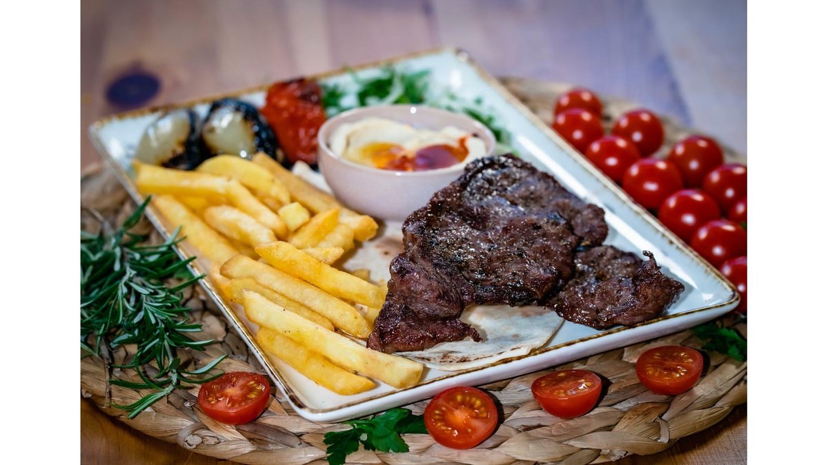 Carne de vitel, garnitura la alegere, legume la gratar, patrunjel, ceapa, hummus
