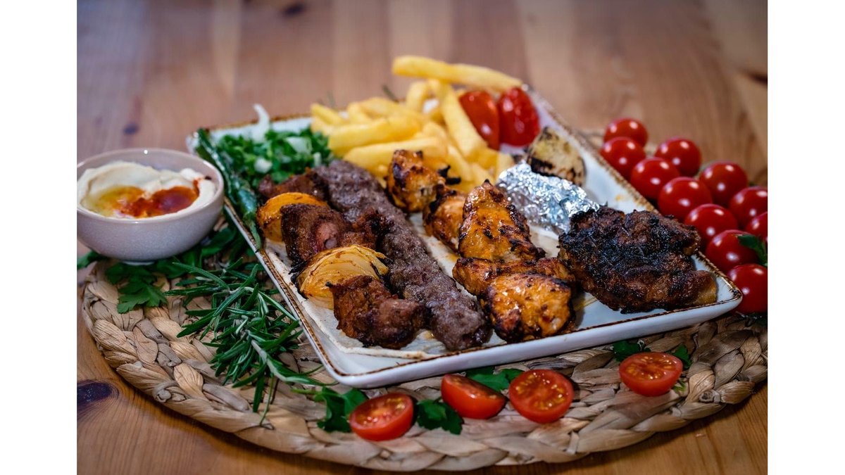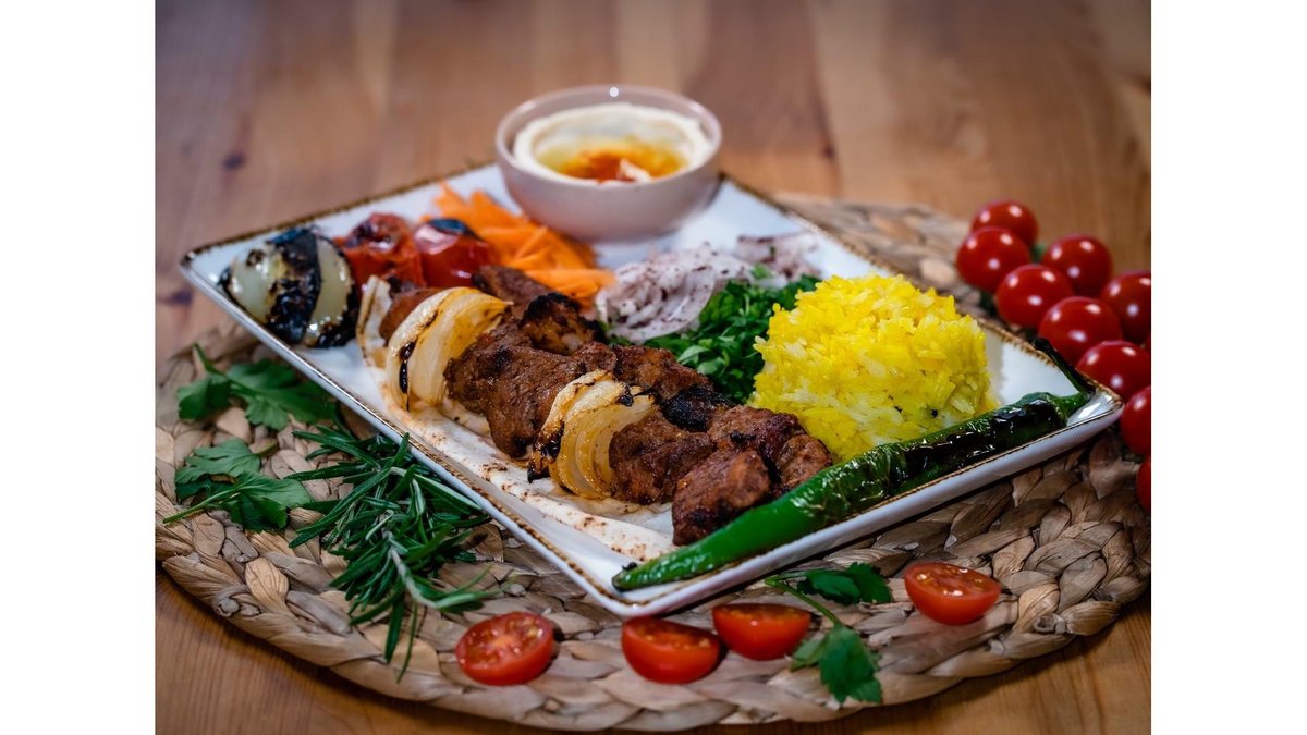 Kebab berbecut, patrunjel, ceapa, hummus, sos alb