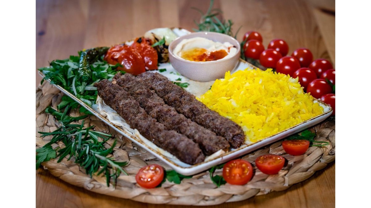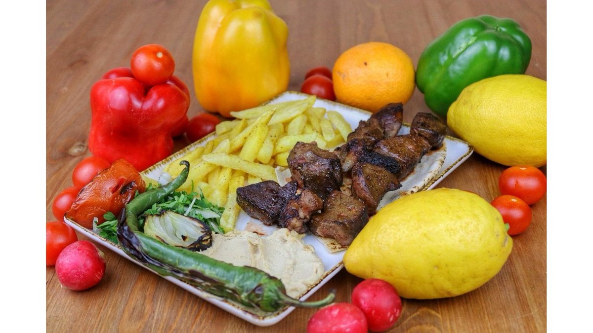 Carne berbecut, garnitura(cartofi sau orez), legume la gratar, patrunjel, ceapa, hummus