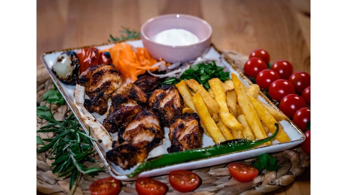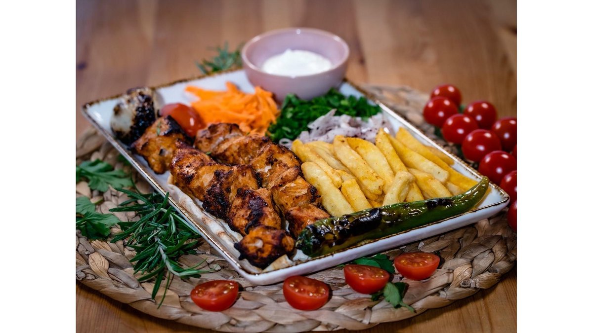 Kebab pui ,salate, sos usturoi, cartofi prajiti