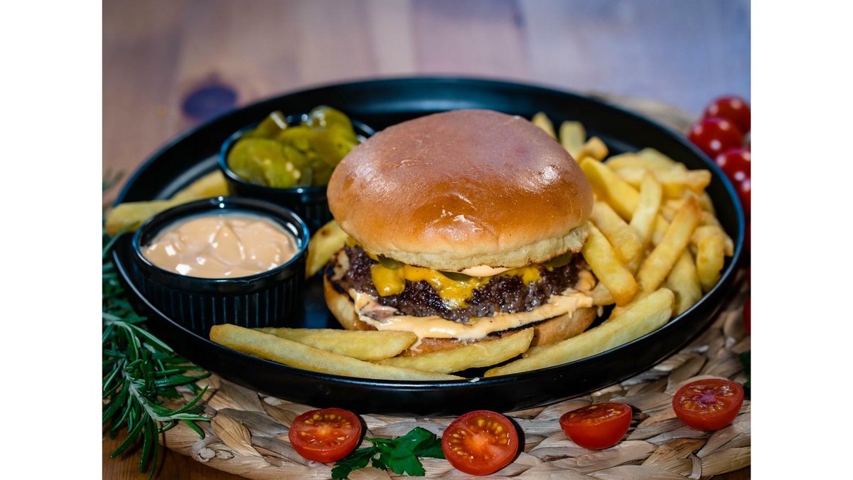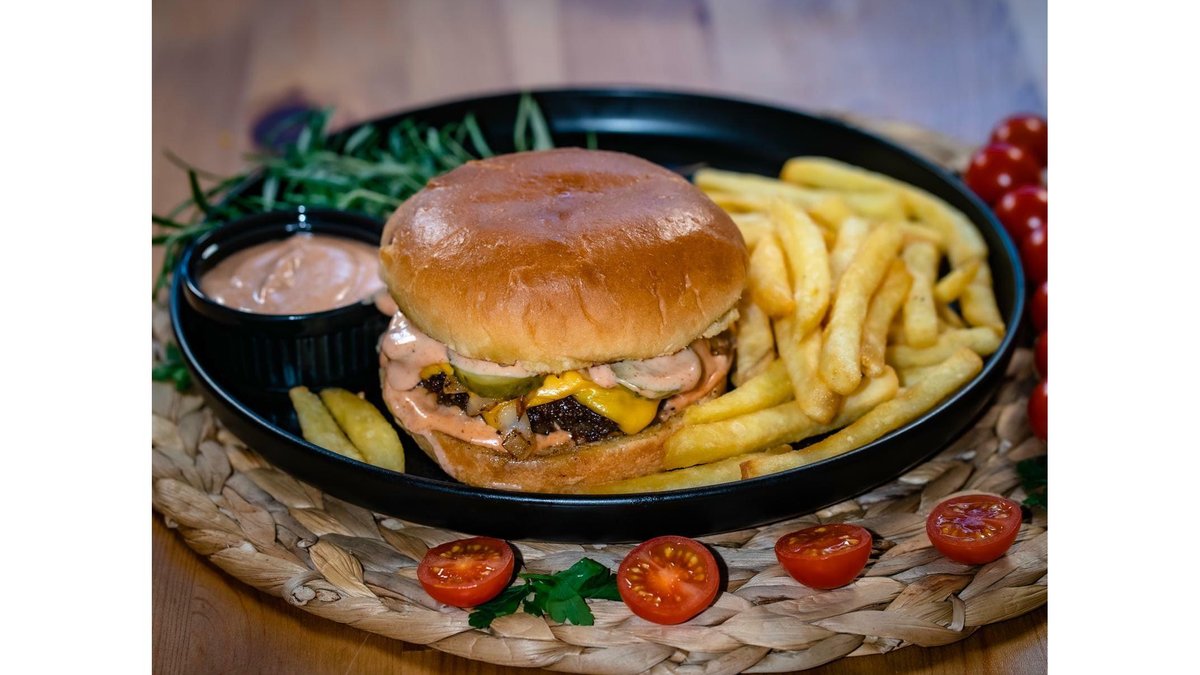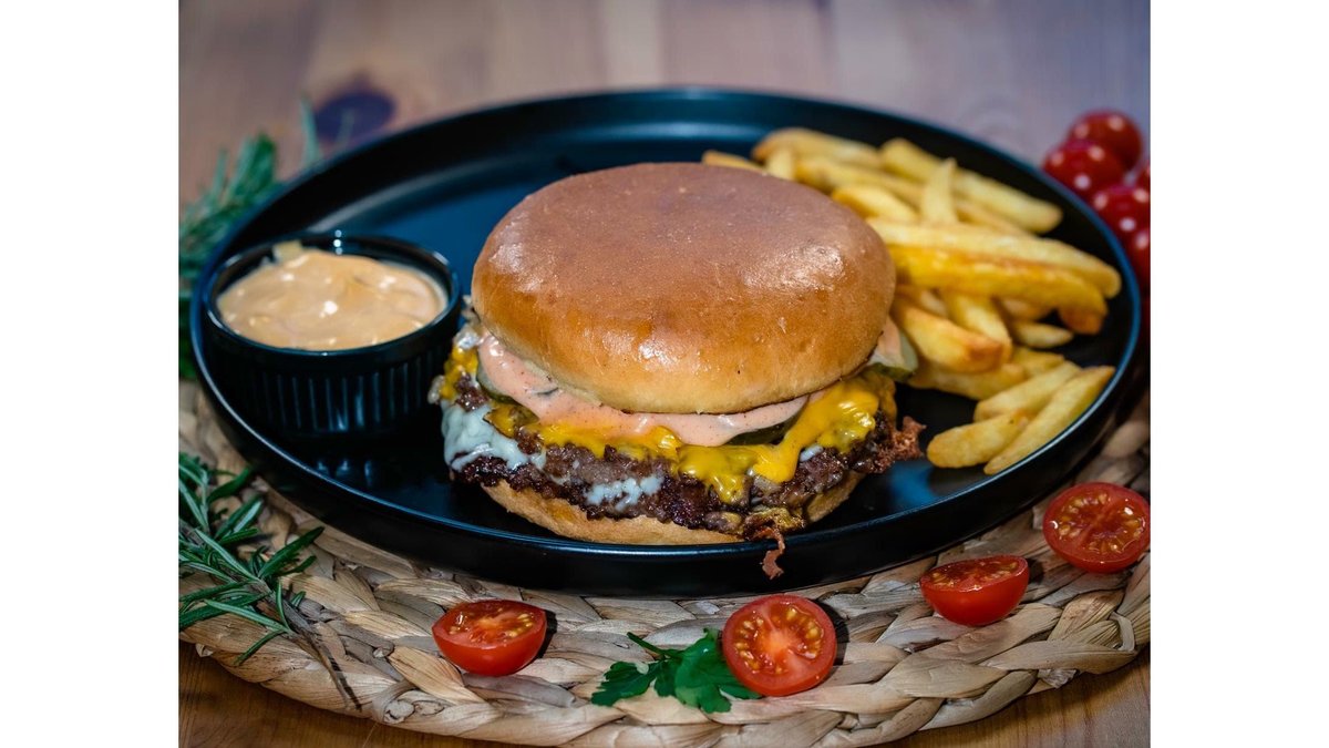 Carne vita, branza cheddar, mozzarella, sos cocktail, castraveti murati, ceapa grill, cartofi, sos